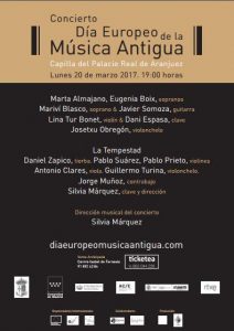 El día Europeo de la Música Antigua, DEMA, es la suma de muchos conciertos, eventos y acontecimientos que tienen lugar simultáneamente en toda Europa en fechas próximas al día 21 de marzo, día de nacimiento de Johann Sebastian Bach. El festival de Música Antigua Aranjuez organiza el día anterior, lunes 20 de marzo, un concierto extraordinario con este motivo que tendrá lugar en la Capilla de Palacio Real de Aranjuez y reunirá a catorce artistas de primer nivel internacional que será grabado por RTVE, y que se emitirá en Los Conciertos de la 2. Tres de nuestras mejores sopranos, Marta Almajano, Mariví Blasco, Eugenia Boix, dos solistas excepcionales Lina Tur Bonet, violín y Josetxu Obregón, violonchelo, junto a destacados músicos como Dani Espasa, clave, Daniel Zapico, tiorba, Javier Somoza, guitarra y el grupo La Tempestad, dirigido por la clavecinista Silvia Márquez darán vida a obras de Monteverdi, Scarlatti, Corelli, Hidalgo, Sor, Martín y Soler, Durón