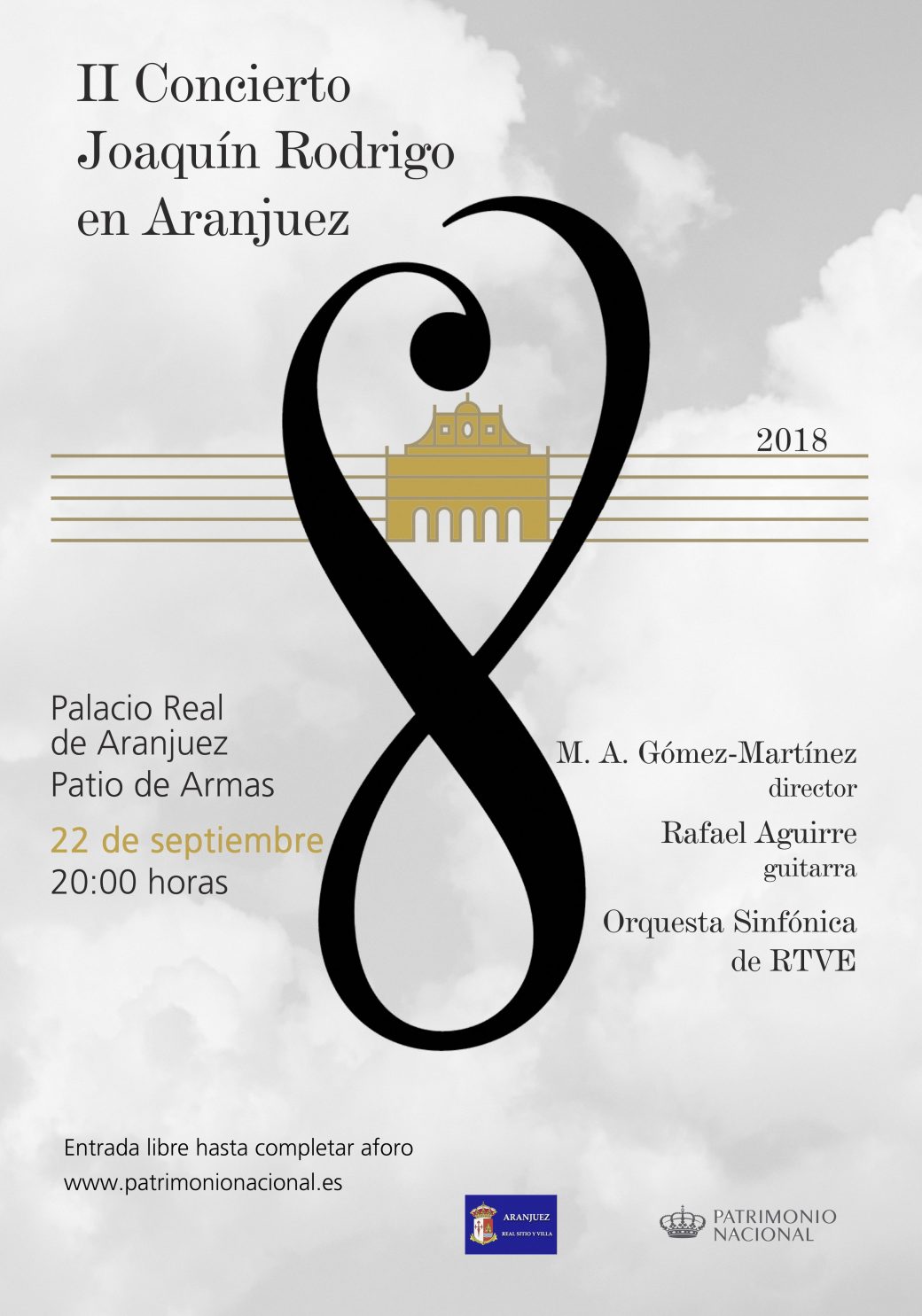 II Concierto Joaquín Rodrigo 18/09/2018 ivanivo Calendar Cuando: 22/09/2018 a las 20:00 Europe/Madrid Zona Horaria 2018-09-22T20:00:00+02:00 2018-09-22T20:15:00+02:00 Donde: Patio de Armas del Palacio Real de Aranjuez Precio: Gratis Musicales